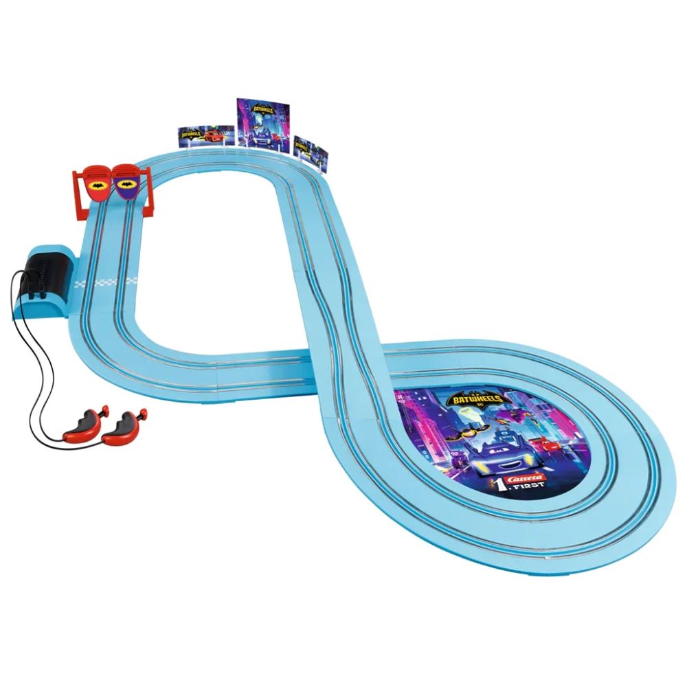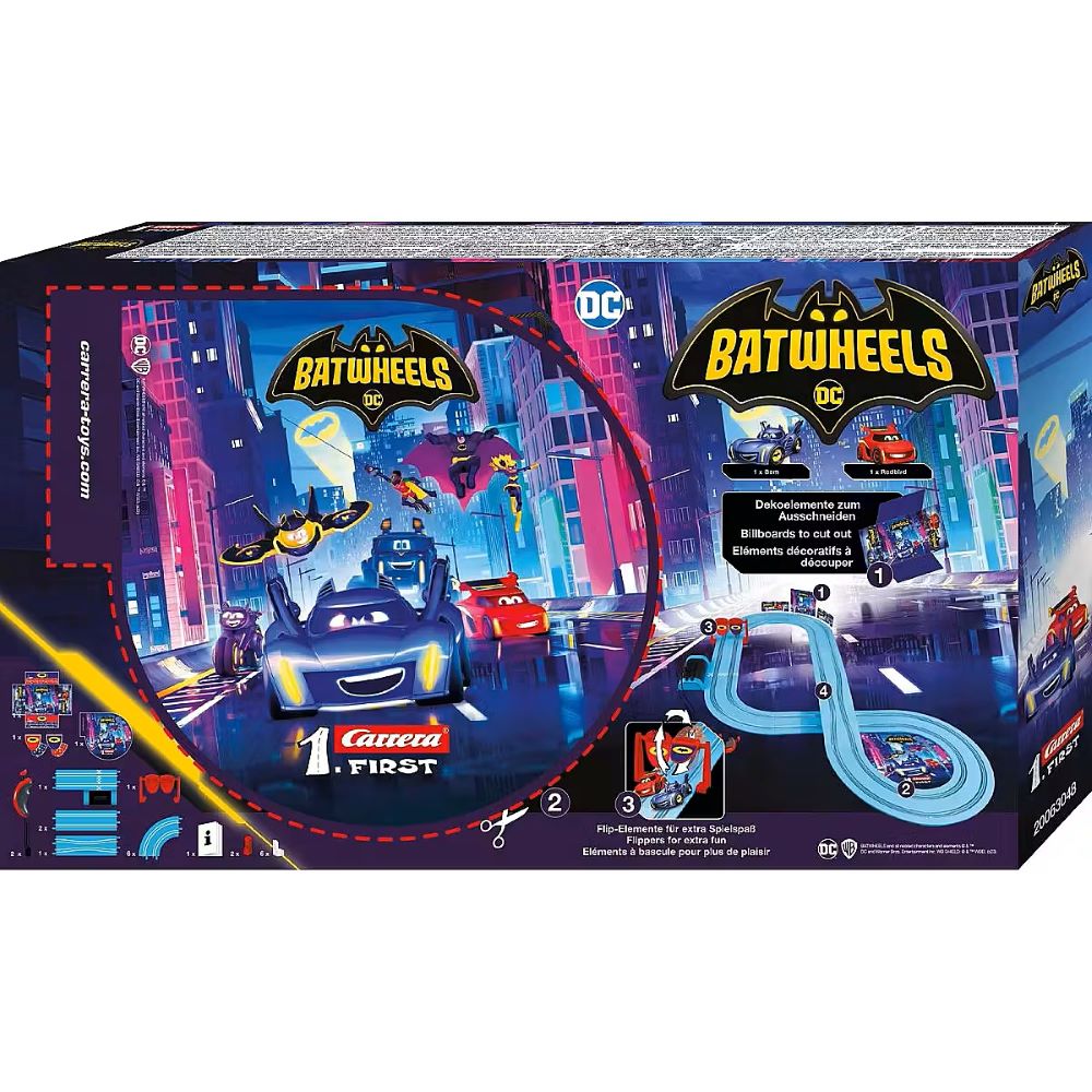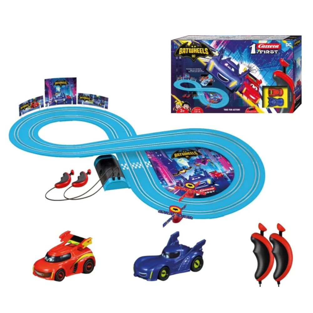In the Batwheels series, Batman's car is brought to life: Batmobile Bam and his team of super-powered vehicles support the superheroes of Gotham at work. Bam and his companion Redbird, Robin's car, also step on the gas on the Carrera FIRST racetrack. In the "Batwheels Ready to Roll" set, the two little supercars race along the blue tracks of the racetrack over a distance of 2.9 meters. Play elements such as the pinball machine and bottleneck provide an extra portion of fun and numerous decorative elements from the series ensure an authentic Batwheels feeling!