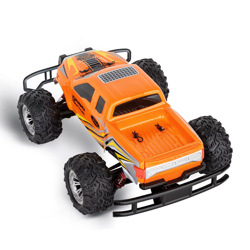 The sturdy, flexible body and huge rubber tires with tread are designed to tackle the toughest trails at home and outdoors. With digital controls and a top speed of up to 30 km/h, the orange Raptor will effortlessly master any terrain!
