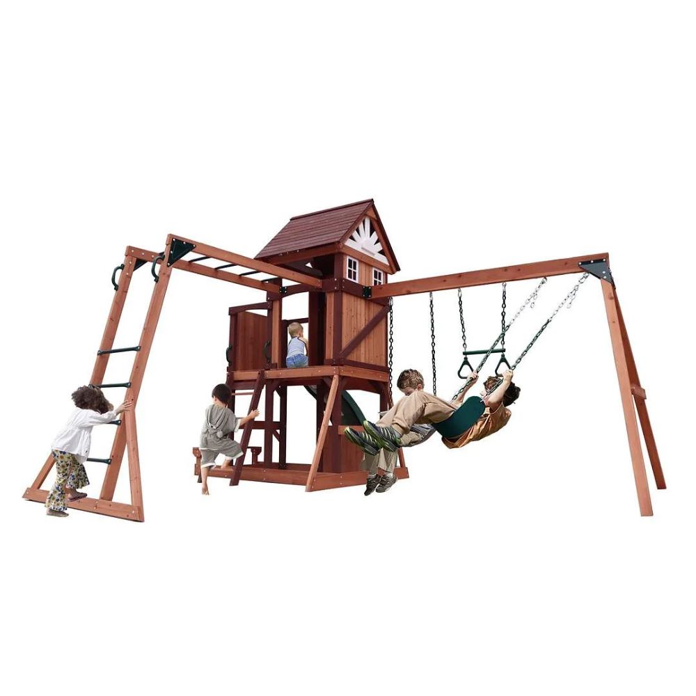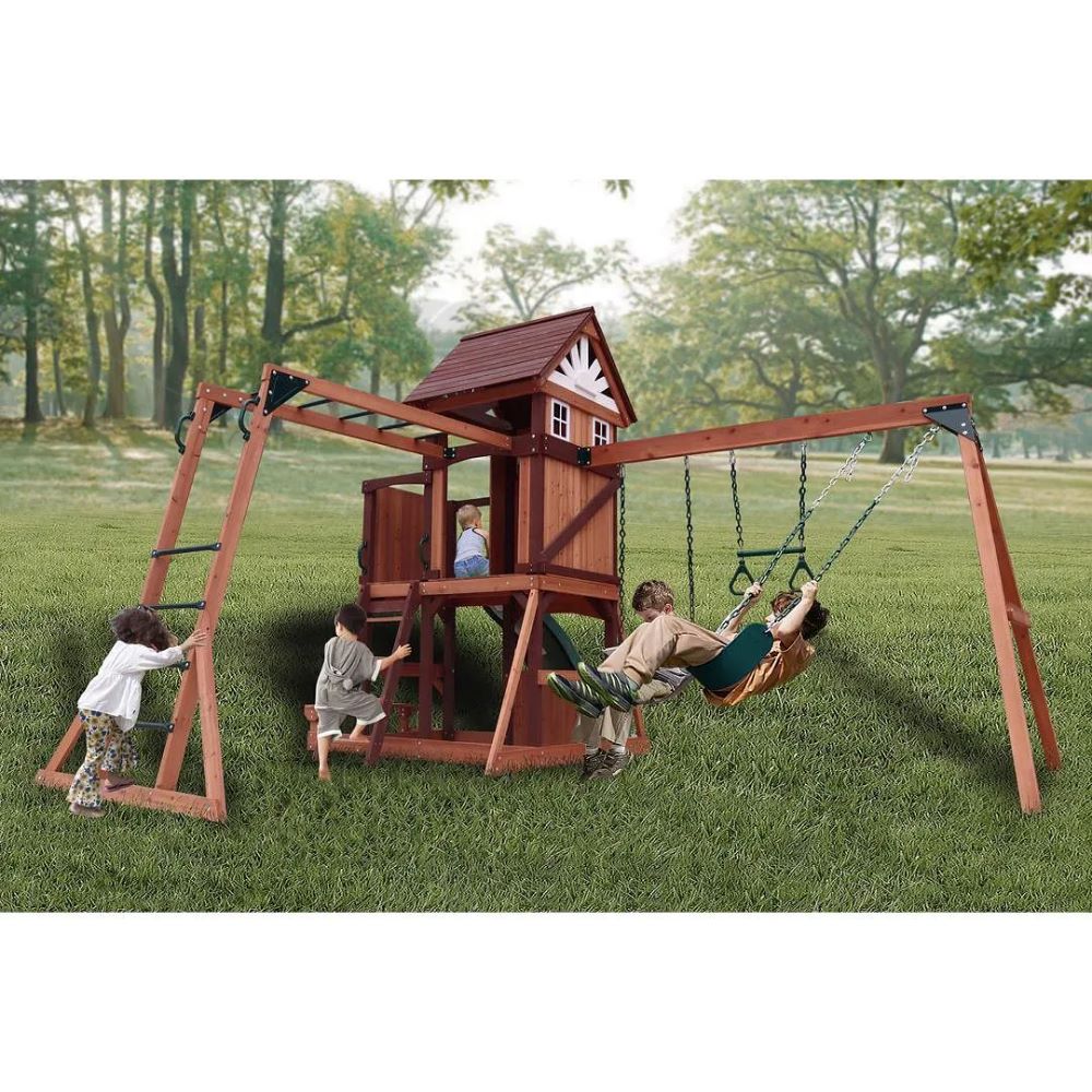- Includes various swings such as standard swings, a glider, and possibly a tire swing or other fun options.
