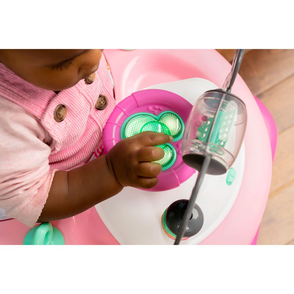 • Removable Toy Station for On The Go: Easily remove the ear-resistible activity station for seated play or fun on the go. The electronic toy station includes spinning beads, light up steering wheel and a baby safe mirror.