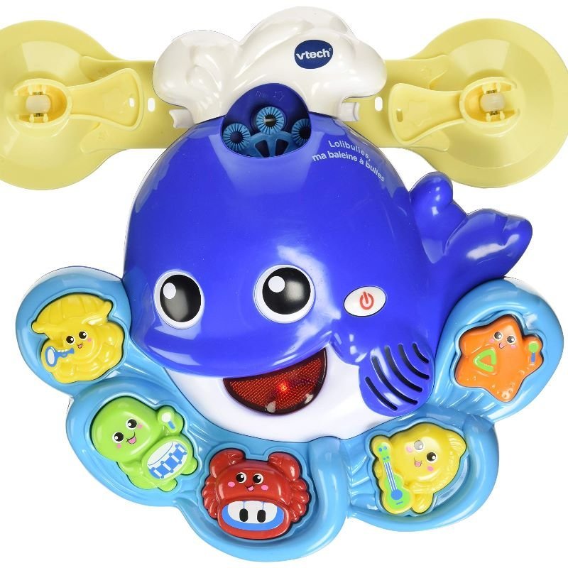 Make bath time fun time with Bubbles the Learning Whale™ by VTech®! Playful rhymes and lively sing-along songs in this bath time bubble toy help develop early language skills while 5 sea animal buttons teach first words, colors, sea animals and more. The bubble whale’s light-up mouth flashes with voice, sound and music responses for engaging play while over 40 melodies, sing-along songs, sounds and playful phrases, engage your child as they have a whale of a time splashing and learning. This water-proof bath toy features a bubble spout for loads of bubble-blowing fun (bubble solution not included) and suction cups that allow for quick and easy mounting to tubs or walls. Splish, splash! It’s learning fun in the bath!