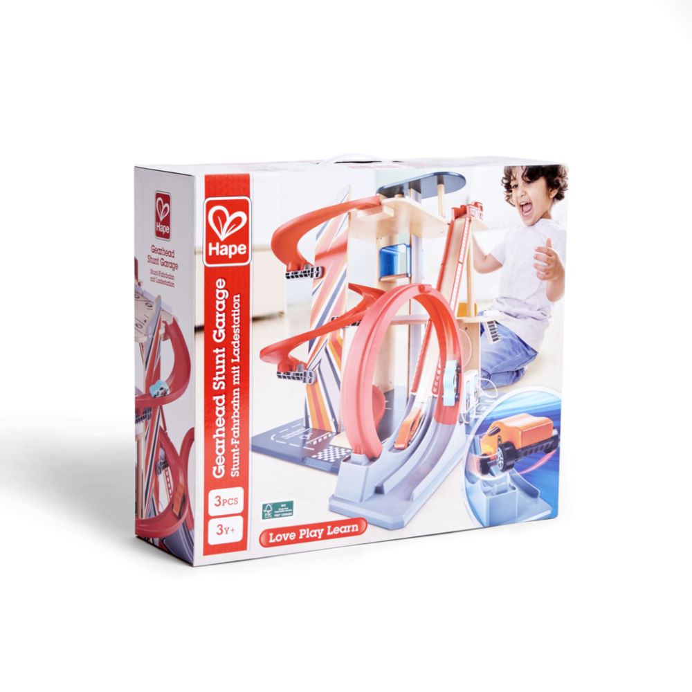 The Hape Gearhead Stunt Garage is a multi-level parking garage with action-packed features. Includes two stunt ramps, a working elevator, pretend EV charging stations, and a 360° anti-gravity loop for thrilling car stunts. Comes with two cars and a service center with selection knob. This playset fosters imaginative storytelling, roleplay, and motor skills. Ideal for car-loving kids who crave high-speed fun and multi-directional action.