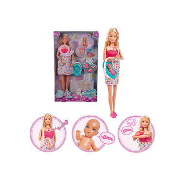 Steffi Love With Baby is a delightful toy that will bring hours of imaginative play to children ages 3 years and up. This set includes a Steffi doll with a special necklace that plays baby heartbeat sounds when pressed against her belly. Once the baby is 'born,' press the necklace again to hear the baby cry. The set also comes with fun accessories such as a blanket, cap, teddy, and a baby seat with a 'try me' function. Let your child's imagination run wild with Steffi Love With Baby from London Toys.
