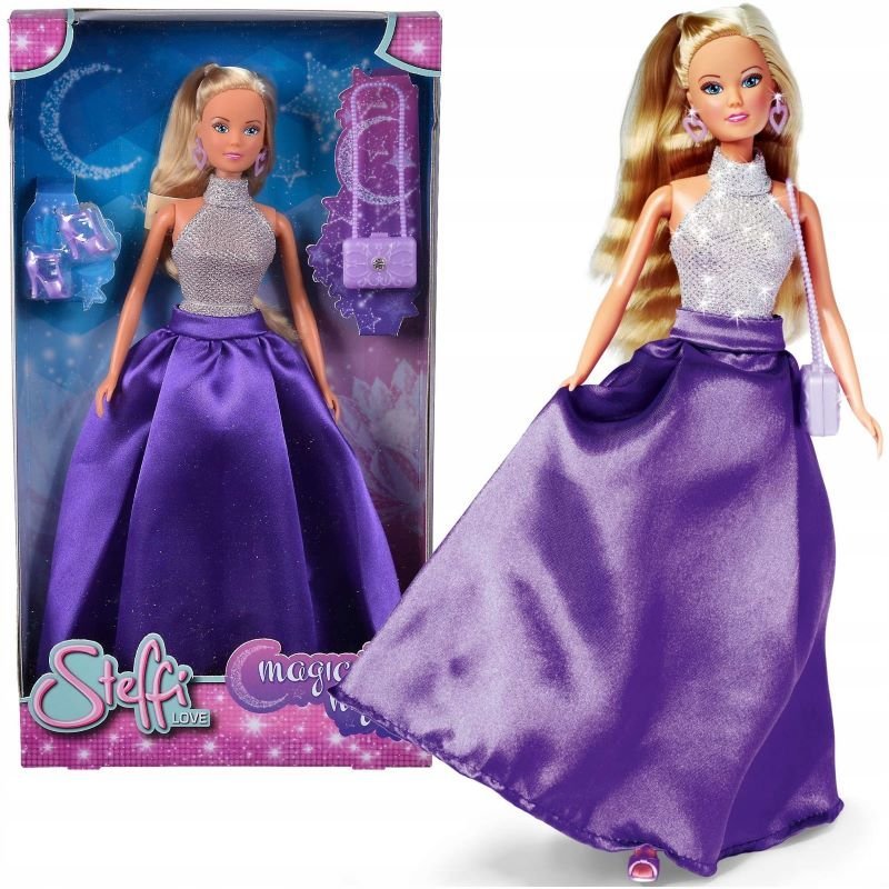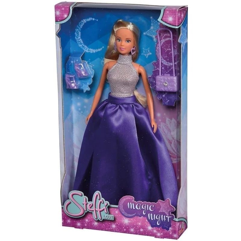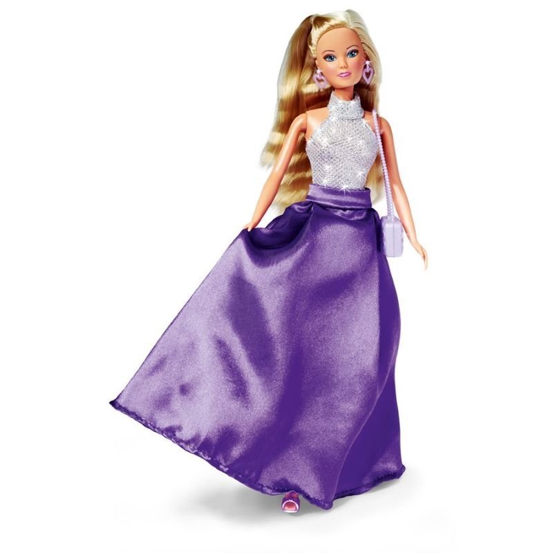 Steffi fashion doll 29cm. Steffi wears a gorgeous outfit with a purple satin skirt and a sequin top, earrings, a bag, and high heels. She's ready for a magical and glamorous night out with her friends.