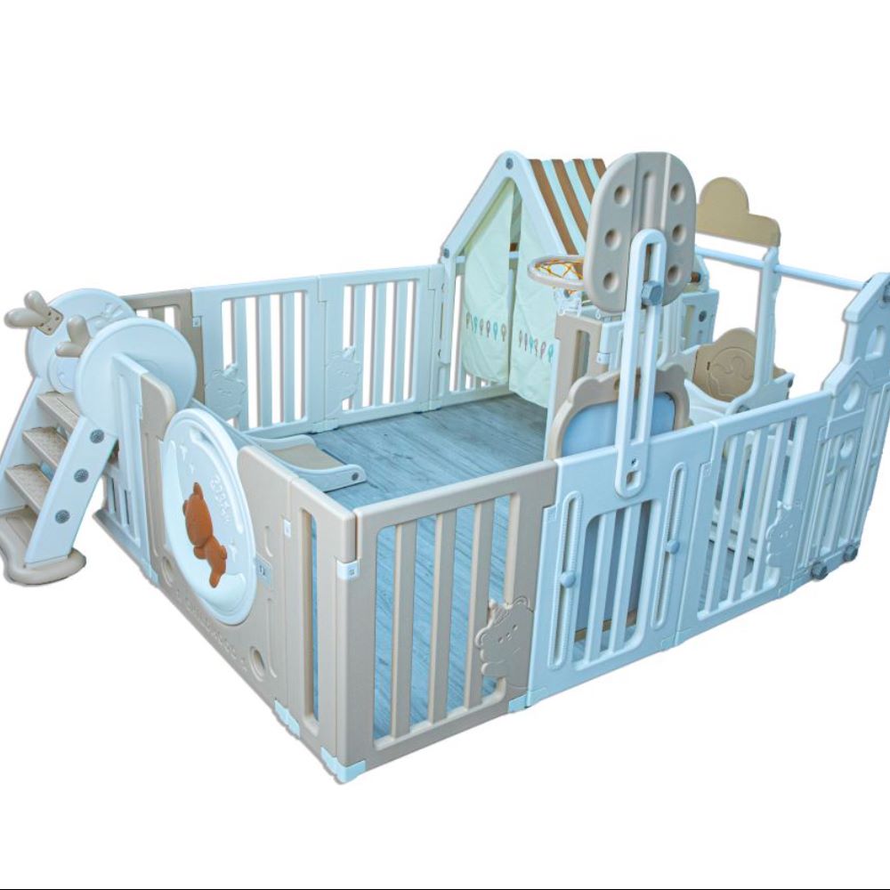 This Little Toddlers spacious and interactive playpen offers a secure and engaging environment for toddlers. Bear Moon Playpen (no mat included). Includes a drawing board, basketball hoop, small house and swing. Safe and spacious design crafted from durable materials for comfort and protection. This multi-activity playpen is made of non-toxic plastic (HDPE) that is safe for children to use, making it lighter than wood, easy to carry, and affordable. Your baby can climb or walk inside, which can help the baby learn to crawl or walk to a certain extent. And parents can also enter the fence to play or rest with their baby. Safety lock ensures that the playpen stays securely closed, so you can have peace of mind while your child is playing. When you want to clean up, you can fold it up without disassembling it, and it will not take up much space. Made of lightweight plastic, easy to clean and carry.