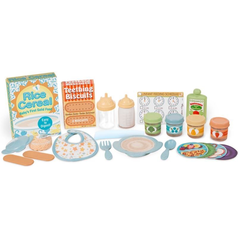 When it's time for kids to feed their special babies meals and snacks, this 24-piece set offers the perfect selection of realistic feeding accessories sized just right for dolls and stuffed animals! From a bottle with "disappearing" milk, a sippy cup, applesauce squeeze pouch, and baby food jars, to meal inserts, cereal Os, rice cereal, and teething biscuits, kids will love the variety of food they can offer their babies. There is a wipe-clean bib, durable divided dish, utensils, and snack container, and a double-sided reusable activity card. With Mine to Love toys, kids three and older can explore grown-up roles and responsibilities while having endless fun caring for their babies. (Dolls/stuffed animals not included with this set.)