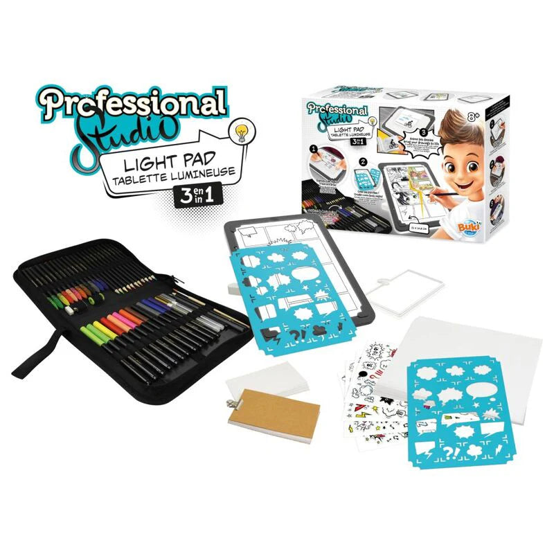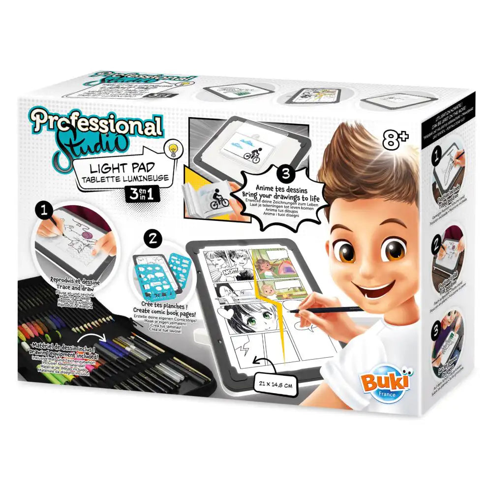 The Buki France 3-in-1 Light Pad is a versatile and portable tool that allows you to draw, trace, and create comics and flipbooks. With its LED light feature, you can easily trace templates or illuminate your artwork. The pad also comes with stencils for creating blank comic book pages, perfect for unleashing your creativity. It can be used flat with the 4 feet, tilted using the stand in the centre, or placed on your knees for comfortable drawing. Plus, a drawing bag and various pens are included for your convenience. Get your hands on this amazing product from London Toys today!
