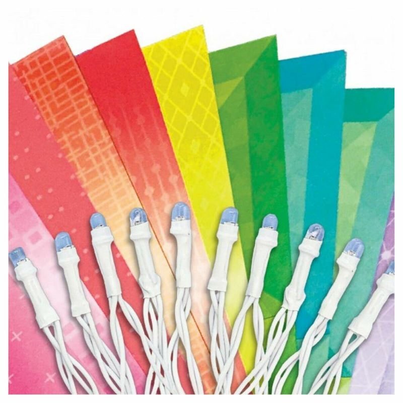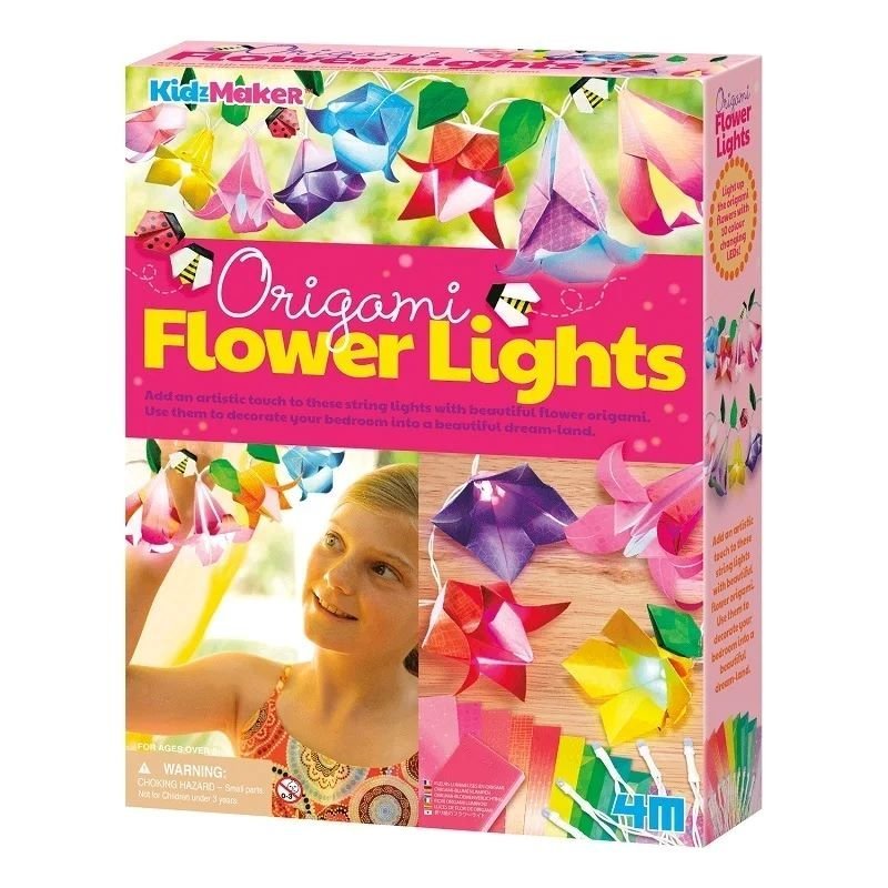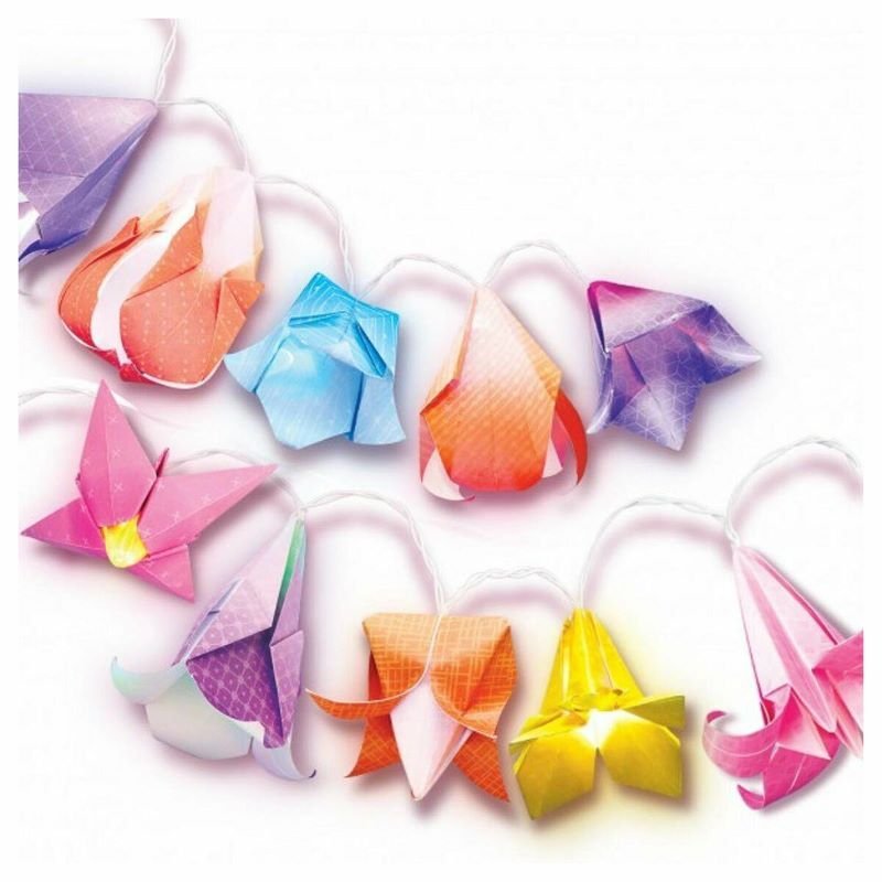 Contents: string lights with 10 colour-changing LEDs, 15 sheets of origami paper, adhesive tape and an instruction booklet. Also required but not included: 2 x 1.5V AA batteries and a small crosshead screwdriverInstruction booklet for 10 different flowersColour-changing String Lights with 6 colours, over 180cm longLight up the origami flowers with 10 colour-changing LEDs! Age: 6 Yrs +