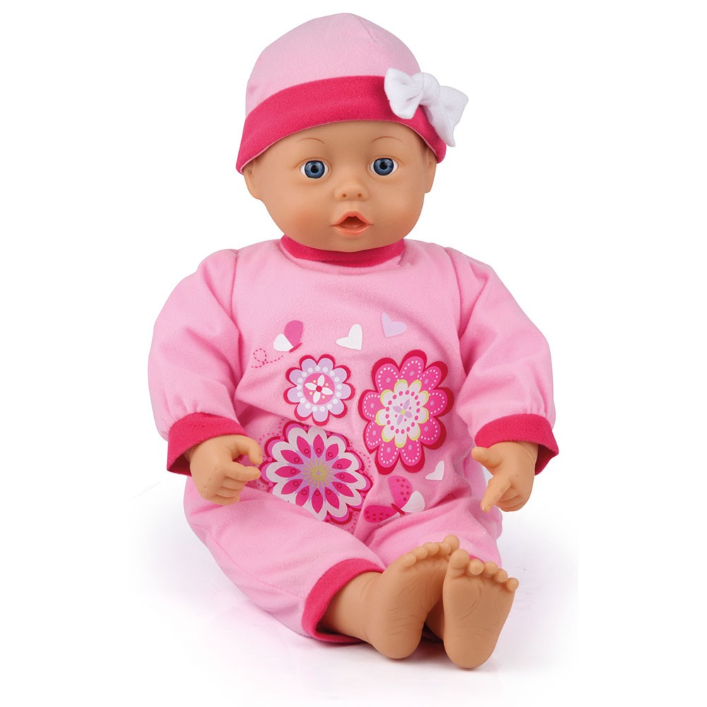 The cute baby doll is 38 cm (15 inch) and has a soft body. When you press her tummy she laughs, cries, giggles or makes other sweet baby sounds (24 in total). Thanks to her soft body the baby doll is perfect for the child's cuddling time. Moreover, she closes her eyes when she is laid down. Thanks to the included dummy and bottle the doll can be comforted and fed. With her beautiful outfit and her handy size, the doll is the ideal companion for the kindergarten or to a friend.