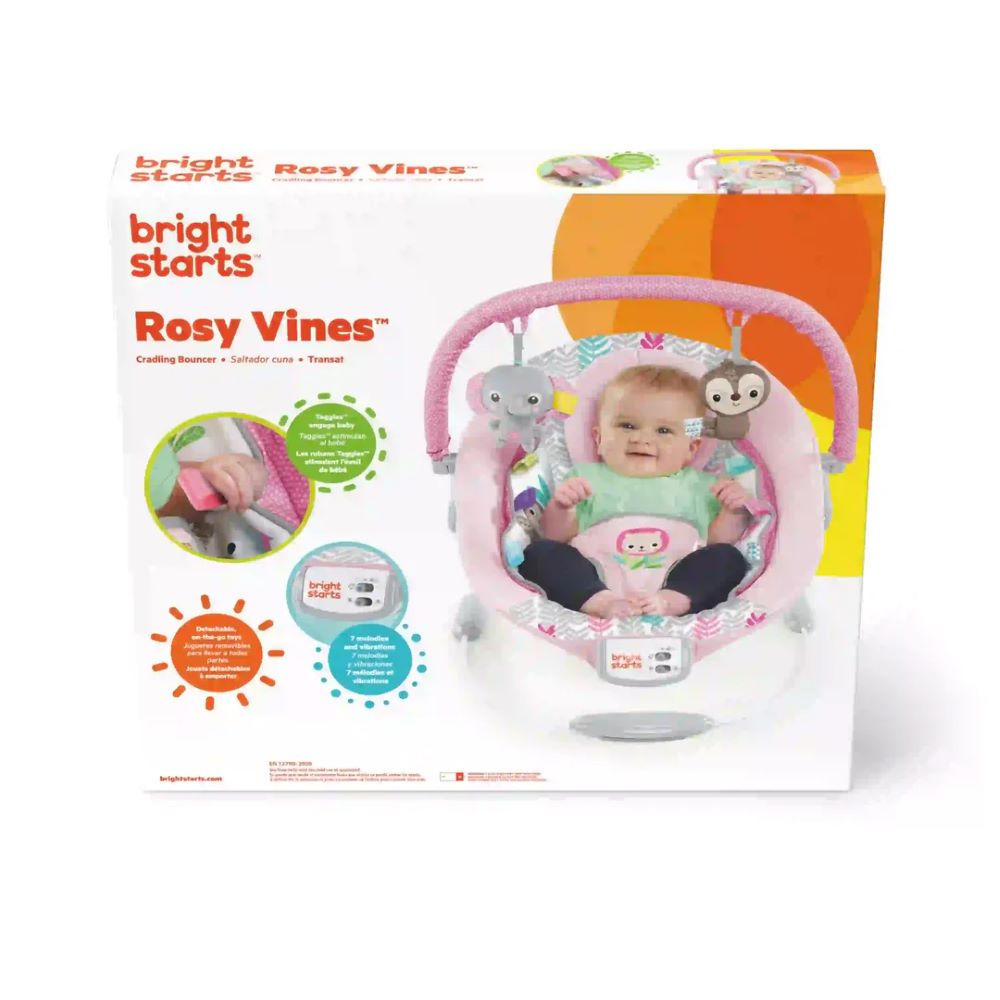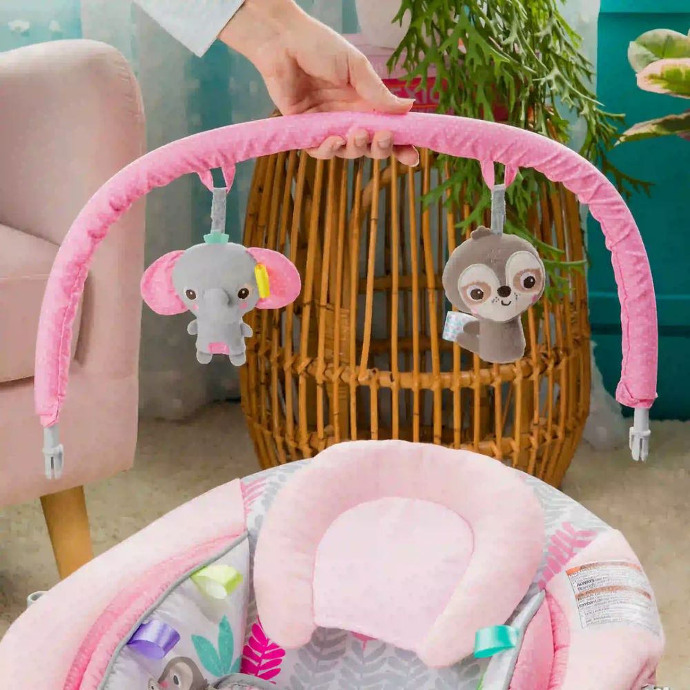Every bounce is a jungle of joy with the Rosy Vines bouncer from Bright Starts. Made with plush fabrics, this is the snuggliest bouncer for your little one. The deep comfortable seat keeps baby secure, and the removable headrest adds a cuddly cushion for your little one’s head. Non-slip feet and a 3-point harness make this baby bouncer wiggle-proof for every wild child. Baby’s soon-to-be favorite seat is surrounded by the Taggies babies just love to touch! Hanging from the toy bar baby will discover two plush animal pals to reach, bat and grasp. When baby needs some time to relax, and you need a second set of hands, this bouncer’s soothing motions, melodies and vibrations will help keep her calm.