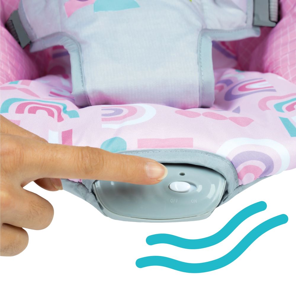 Paradise is in full bloom with the Pink Paradise Vibrating Baby Bouncer from Bright Starts! This bouncy seat helps your curious kiddo play and practice motor skills. The silly monkey and friends will spin up sweet smiles as baby reaches to bat and spin the tropical toys hanging from above. Peek-a-boo… I spy a baby-safe mirror on the other side of the spinning monkey! Introduce baby to their own reflection with this surprise & delight toy. A deep comfortable seat, non-slip feet and a 3-point harness make this baby bouncer a safe spot for playtime. That means you have more hands-free moments with baby securely seated in view. Help keep baby calm and content with the bouncy seat’s calming vibrations. Easily remove the toy bar with one hand when you need to scoop up your baby after playtime. When you're on the move, simply lift on each side when baby is not in the bouncer to move from room to room.