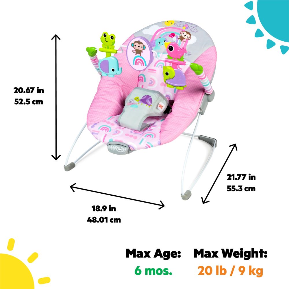 - This pink bouncer with rainbows makes a great baby shower gift idea; assembled dimensions 21.18" (H) x 18.23" (W) x 24.49" (L)"; made for ages 0-6 months or up to 20 lbs