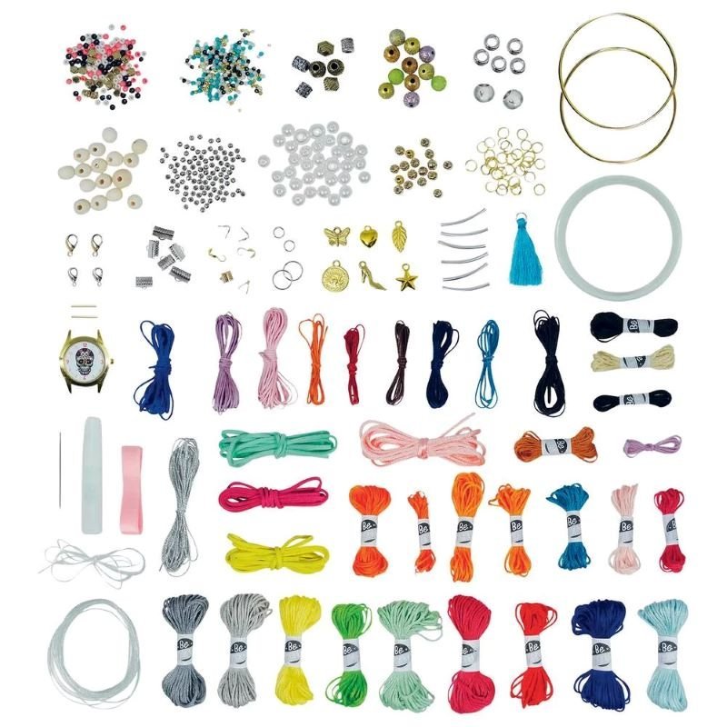 A watch face is included so you can weave the straps! Included : 1 watch face, 1 cotton threads in 20 colours, 1 waxed threads in 8 colours, cords in 2 colours, straps in 3 colours, 1 plastic bracelet, 2 metal bracelets, 1 pink ribbon (80 cm), 1 pompom, 6 charms, assorted beads, assorted clasps, 38 rings, transparent elastic thread (70 cm), white thread (5 m), 1 needle, 1 tube of glue, instruction sheet in colour.