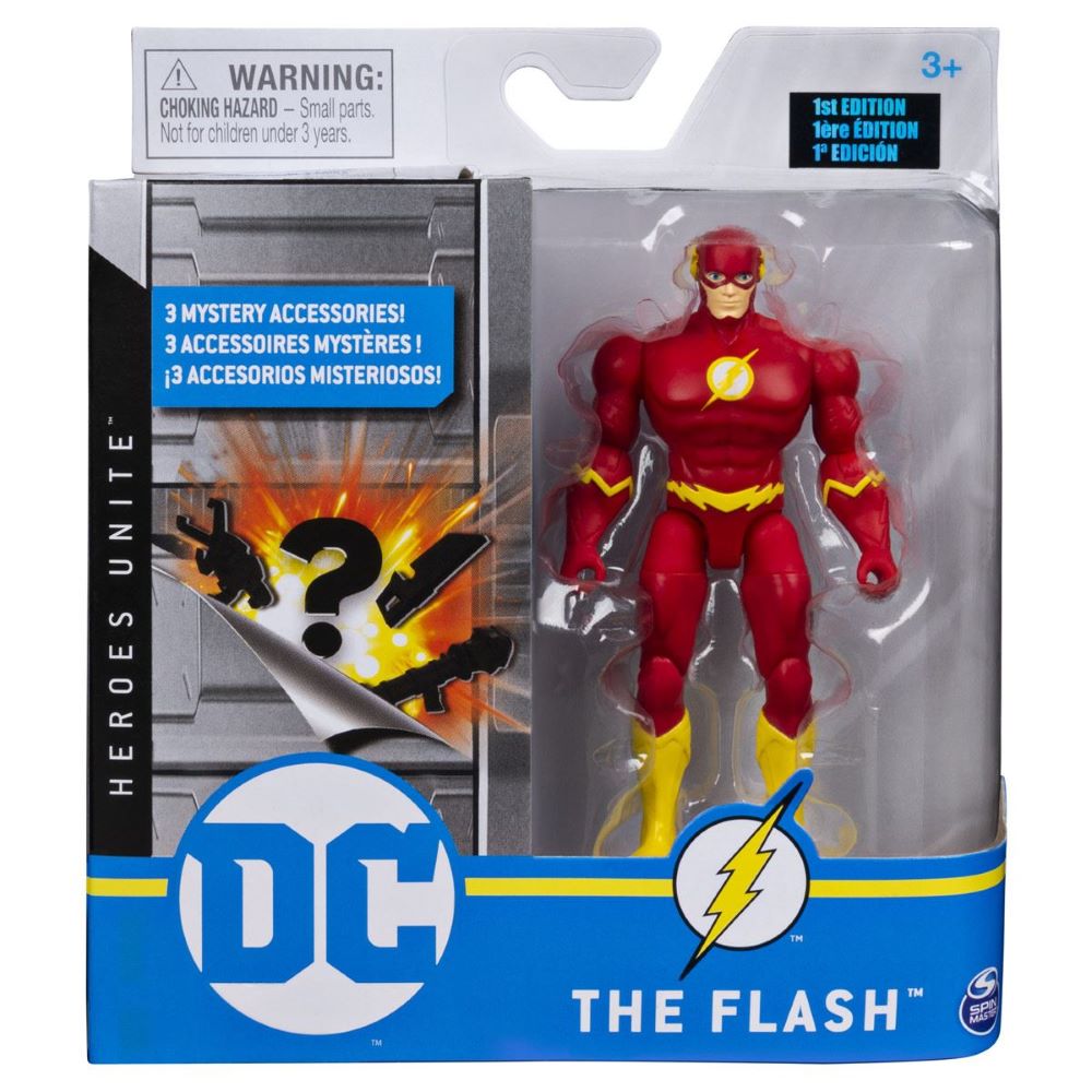 The DC Universe Basic Figure assortment features The Flash action figure with 3 mystery accessories. This 1st edition collectible is designed for DC Comics fans ages 3 and up, featuring the iconic speedster in his classic red and yellow costume.