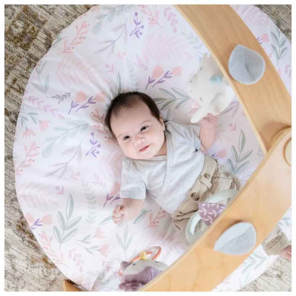 Give baby 3 ways to relax, stretch and play with the Ingenuity Cozy Spot Reversible Duvet Activity Gym - Calla. Featuring a patent-pending, ultra-plush mat for baby’s comfort and a SlimFold wooden toy bar for quick and easy storage, this soft, cozy play space gives baby 3 ways to play and grows with baby from 0 to 36 months. Baby will love the mat’s cloud-like comfort for tummy time, seated play, or lay and play, and parents will love the reversible duvet’s 2 gender neutral print choices that easily match modern decor. When play time’s through, simply lower the wooden toy bar and use the cloud-like mat’s handles to easily fold, store, and carry baby’s favorite play gym wherever your travels take you. 5 detachable toys feature natural materials and engage baby during play: silicone apple toy, plush bear, wooden ring toy, mirror, and a bead rattle. Duvet mat and removable cover are machine washable. Toys and bar wipe clean. Assembled dimensions: 19.3 x 32.3 x 32.3 inches.