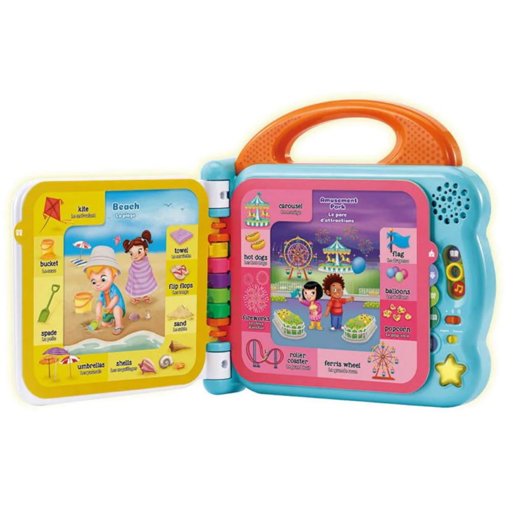 Explore words about places kids love with the 100 words about places I go bilingual learning book! Featuring age-appropriate words, this interactive book teaches about people and objects in 12 unique places in both English and French. Go to the beach in any season and discover words in two languages about things to bring and surprises to find. The school, the park, the farm, the amusement park and more locations can light up your child's world and spur their imagination. Ten touch-sensitive locations on each page teach about words, colours and counting in the context of unique places.