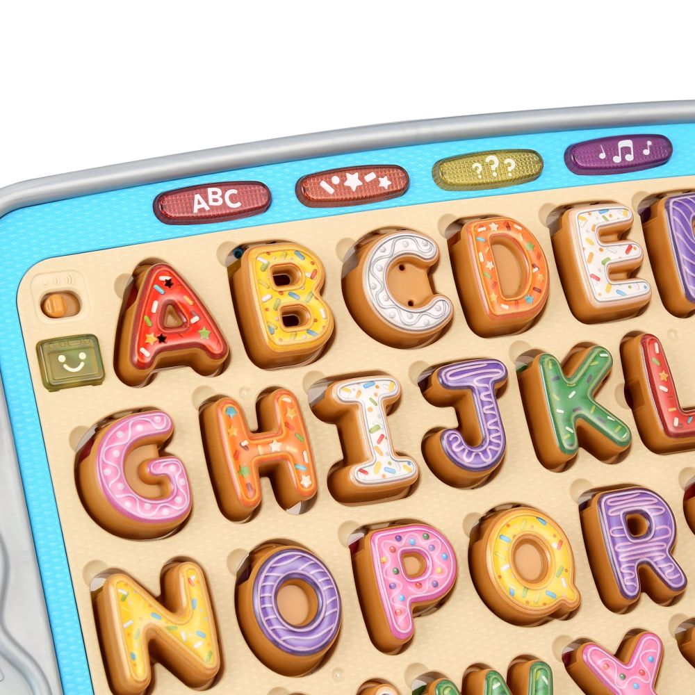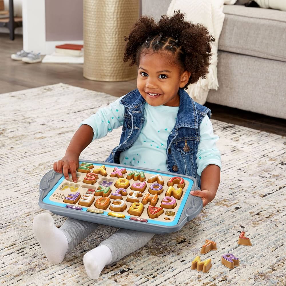 Learning letters is a tasty treat with Match & Learn Cookies Little pastry chefs can pretend to make and bake 26 yummy-looking letter cookies. Press each colorful cookie into the tray to hear letter names, letter sounds, colors and flavors. Now you’re cooking! Take the cookies off the tray and serve the sweet treats to friends and family. Let’s bake more cookies. Listen closely to hear which cookie to bake based on the name of the letter, the sound it makes, the frosting color or its flavor. Find the letter A with red frosting. It’s an apple cookie. Match the correct cookie to the letter-shaped cookie tray cutouts to bake the perfect batch. Chip, chip hooray! Celebrate success by pressing the light-up oven button and sing along to a baking song. You’re one smart cookie.