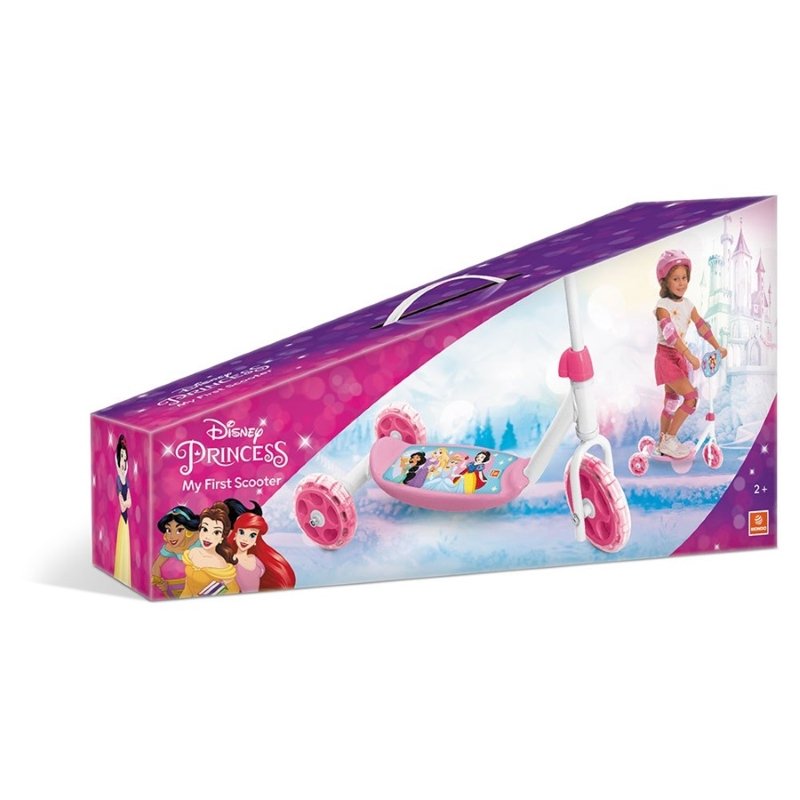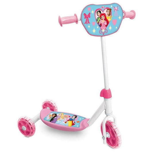 My first Princess scooter.•3 Wheel Scooter, with a modern design of the Princesses.•With front storage bag with the design of the Princesses.•The frame is made of sturdy steel and the two rear wheels provide great stability, ideal for learning balance.•The front wheel is 5 inches and the rear wheel is 4 inches.•The wheels, being translucent, are quiet.•The footrest is wide and non-slip.•The height of the handlebar is adjustable in two positions: 67 and 70 cm.•Maximum supported weight: 20 kg, approximately.•Recommended ages: +3 years.•Assembly required.Warning: Adult supervision requires adult supervision!