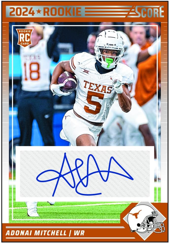 The Panini Score series is a popular NFL trading card collection that offers both veteran and rookie player cards. The hobby pack format provides enhanced collecting opportunities compared to retail versions. Each pack is part of a larger hobby box that contains 10 packs total, with boxes averaging 4 autographs. Individual pack contents may vary, and autographs are not guaranteed in single packs.
