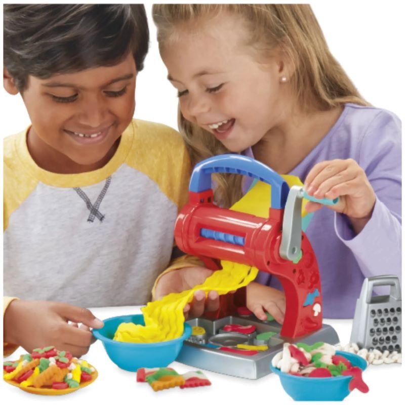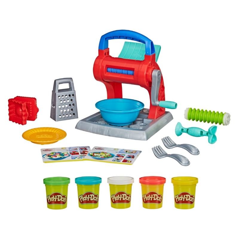 The Play-doh Noodle Party Playset is a fun and easy toy for kids aged 3 years and up. With this pasta maker, children can switch between two rollers to create two different shapes of pretend noodles. The set comes with all the necessary accessories for a play-doh pasta chef, including a cheese grater, bowl, plate, fork, and squishy play-doh compound. But the fun doesn't stop there, as the set also includes a ravioli mold and bowtie stamper for even more imaginative play. Kids can get creative and make their own unique creations by adding silly shapes like shrimps and veggies. The set includes 5 non-toxic play-doh colors, making it a great activity or gift for kids who love to play with modeling clay. However, it is not suitable for children under 3 years due to small parts. Let your child's imagination run wild with the Play-doh Noodle Party Playset from London Toys.